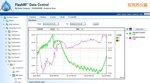 DeltaTrak公司的FlashRF数据中心是基于云基础应用技术,,它使系统有了更大的视图和本地安装的2.4 GHz射频无线温湿度网络监测的控制。