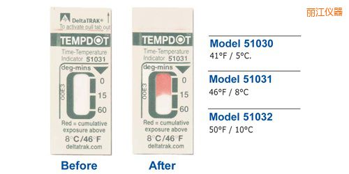 DeltaTrak提供满足你各种需要的标签:WarmMark温度标签、高温热标签和TempDot时间温度指示标签显示温度变 化超过预设的时间。FreezeCheck和ColdMark温度标签用于显示运输温度低于0℃。商业洗碗机使用的TempDot高温热标签可显示最终冲 洗水温是否达到71℃(HACCP体系所要求的温度)。 TempDot时间温度标签,,型号51030-51032,,是一种低成本的标签,,可显示温度高于阈值长达60分钟。当温度超过临界值,,标签颜色变化开始,,但温度下降到阈值之下时,,标签颜色变化停止,,如此来显示累积温度超过的时间-,,对于许多质保应用来说,,度分钟是非常的重要的概念。有三种温度阈值5℃、8℃和10℃可供选择。 这个低成本标签可以指示一段长到60分钟暴露在临界点温度。