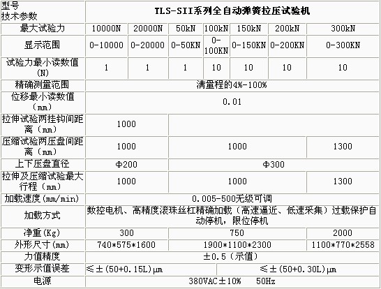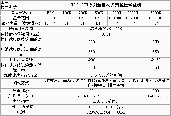 产品概述: TLS-SII系列全自动数显式拉压试验机是适用于拉压试验的新型试验设备。试验机主机的设计具有外形美观、操作方便、性能稳定可靠的特点。试验机 采用数控电机及先进的单片机控制技术加载及控制,烟台弹簧试验机价格,能实现双速预置。实现了高速逼近,低速采集。提高了测试精度,保证了试验效率。 功能特点: 自动变速检测5个测试点,并自动返回到试验初始位置 LED显示,人机对话直观明了便于操作 可以选择多种测试方法,顺次自动完成一批工件的测试,空气弹簧试验,可查看已测数据 传感器引起的变形量可以补偿,既传感器和整机刚度引起的变形不影响位移精度。 可实现试验力、试验速度、位移等多种控制方式,具有以下功能: 设定变形量F,检测弹簧的试验力P; 设定弹簧的剩余高度H,检测弹簧的试验力P; 弹簧变形的检测已工作压盘接触弹簧为准,此时试验力有反应,弹簧实验机,试验力(初始力)的大小任意设定。 技术参数: