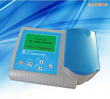 应用领域 适用于牛奶、奶粉、牛初乳及牛初乳粉中蛋白质的快速定量测定。 仪器特点 ● 检测速度:包括样品前处理在内,,检测每个样品只需5~10分钟。 ● 抗干扰能力:该仪器测定样品中蛋白质氮,真实反应样品中蛋白质的含量,不受三聚氰胺、尿素、硝酸铵及甘氨酸等非蛋白氮的干扰。 ● 操作方式:被测样品采用流通引入方式,取代传统的样品池,,方便用户操作、清洗及维护;克服了传统凯氏定氮法样品前处理系统繁琐,操作步骤繁杂等缺点,避免了传统方法需向样品中加入浓硫酸,高温消化等危险性步骤。 ● 数据存储:数据存储量大,,存储容量大于2000条检测数据。 ● 单机软件:单机具有数据处理、结果统计等功能。 ● 数据接口:外设USB、RS232接口。 ● 耗材配件:提供完备的专用前处理设备和耗材,一站式服务。 技术指标 ● 光源: 超高亮发光二极管 ● 测定下限: 0.50%(牛奶) 5.00%(奶粉) ● 测定范围: 0.50 %~4.00%(牛奶) 5.00%~40.00%(奶粉) 4.00%~10.00% (牛初乳) 40.00%~80.00%(牛初乳粉) ● 精 密 度: 2 % ● 电源: AC 220V±22V,50Hz±1 Hz ● 尺寸:275x210x130 mm ● 重量:1.7 kg 仪器配置 * 样品前处理设备1套 * 微机接口和数据处理软件1套 * 外置打印机 * 试剂1套(50次)