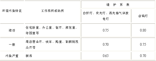 第2.1.4条 在照明设计时应根据光源的光通衰减、灯具积尘和房间表面污染引起照度值降低的程度,除以表2.1.4中的维护系数。