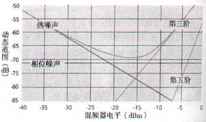 相邻信道功率比(ACPR)或低电平IMD的测量要更困难,更需要注意频谱分析仪的能力。图2显示了频谱分析仪的热噪声、相位噪声和第三、第五阶交调失真与混频器电平的关系。由于精确测量ACPR所需的动态范围接近或超出了很多频谱分析仪的性能极限,所以必须全面考虑之后才有把握进行正确测量。